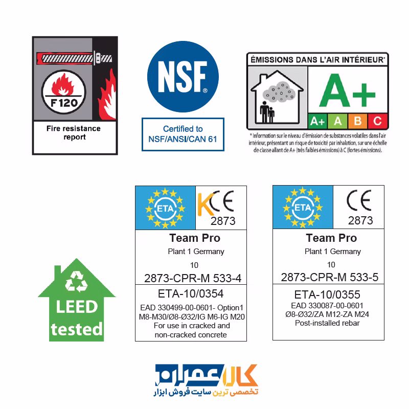 | تاییدیه های کسب شده: | ارزیابی اروپا برای بتن: ETA-10/0354 ارزیابی اروپا برای میلگرد : ETA-10/0355 گواهینامه مصارف آب نوشیدنی: NFS 61 گزارش تست مقاومت حریق: EBB 170019-15en مجوز ملی برای مصارف بنایی |